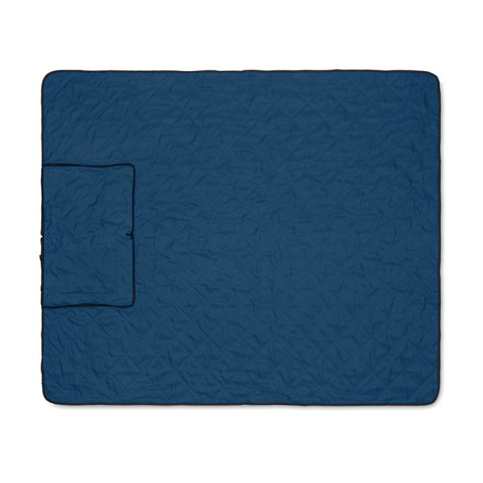 Foldable quilted picnic blanket with plastic coated PEVA on the reverse side. Folds into a convenient carry tote bag and has an adjustable shoulder strap. It includes a large front side pocket.