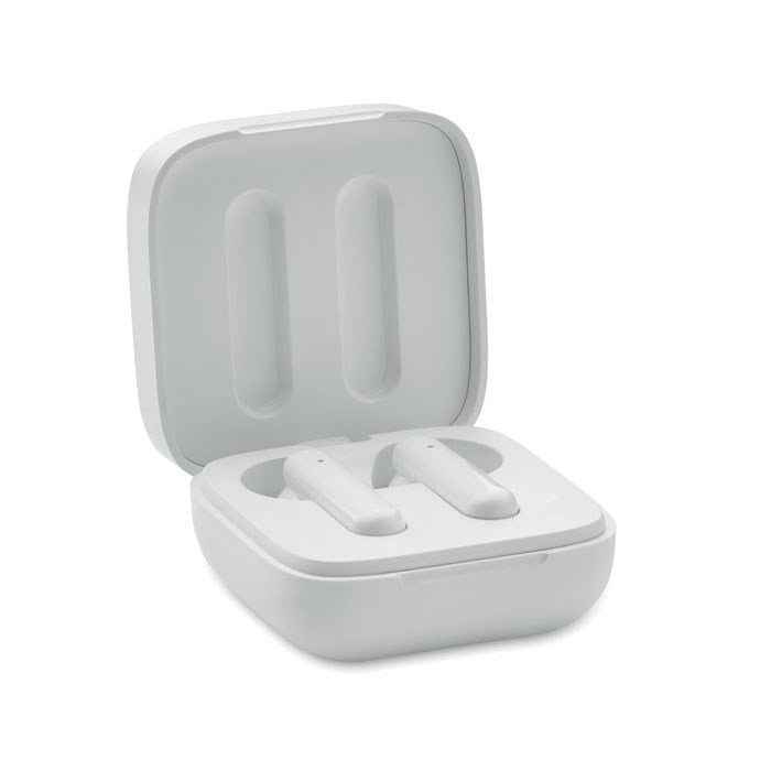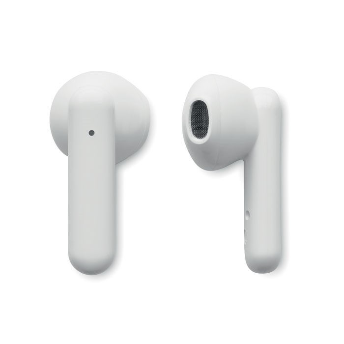 ABS True Wireless Stereo (TWS) 5.3 wireless earbuds with microphone and a 30 mAh battery. Playing time approx. 4 hours. It has a solar charging battery. Auto-pairing. Including a Type C charging cable and a 200 mAh charging station.