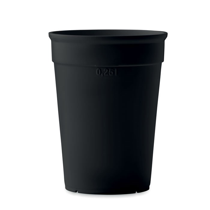 Reusable single wall coffee cup in PP. Capacity: 250 ml. As this is a single walled mug, heat transfer can still occur.