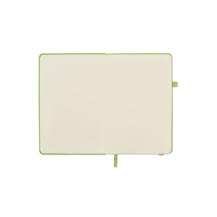 A5 notebook with 70% recycled pre-consumer leather and 30% latex PU cover. Casebound. 192 lined pages recycled paper (96 sheets). Matching cotton elastic closure strap and pen holder.