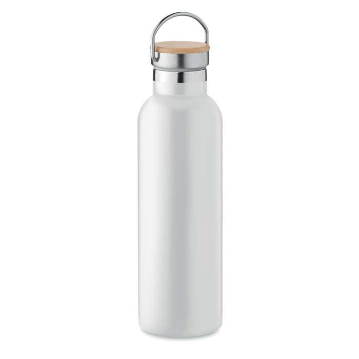 Double wall Stainless Steel insulating vacuum flask with bamboo lid and carry handle. Capacity: 750 ml. Leak free. Bamboo is a natural product, there may be slight variations in colour and size per item, which can affect the final decoration outcome.