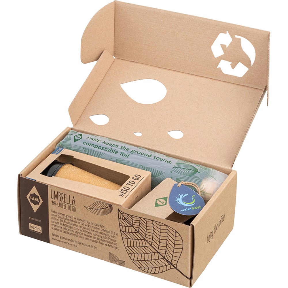 Sustainable set consisting of pocket umbrella and insulated cup Umbrella: easy to handle thanks to safety runner, high-quality Windproof PLUS system for maximum frame flexibility in stormy conditions, polyester pongee cover material of recycled plastics, with waterSAVE® label on the closing strap, wooden handle with promotional labelling option, cup: double walled cup ISO TO GO from Koziol with lid 400ml, material food-safe and fully recyclable, the innovative lid closure reliably covers the drinking opening and air hol, dishwasher safe and virtually unbreakable, packaging: delivery in printed cardboard box
