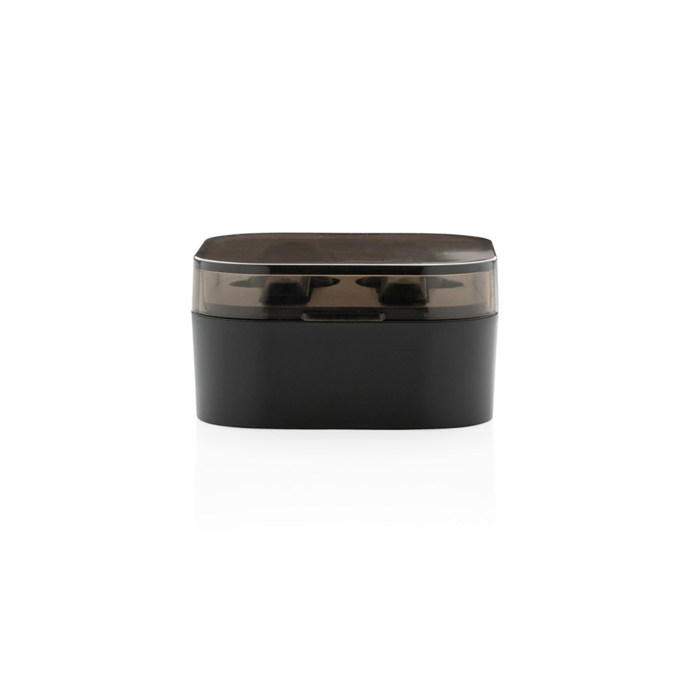 Ultimate freedom while listening to your favorite music with these true wireless earbuds. Simply pair both ABS earbuds to listen to your music in stereo and answer calls (mono). The earbuds come in a stylish charging case which can be charged wirelessly by the included 5W wireless charger. This charger can also be used to charge your mobile phone. The wireless charger is compatible with all QI enabled devices like Android latest generation, iPhone 8 and up. Including 150 cm micro cable. The earbuds use BT 4.2 for smooth connection and have a 50 mAh battery that allows a play time of up to 3 hours and can be re-charged in 2 hours in the charging case. The wireless distance is up to 10 metres. Includes different size ear tips. Input 5V/1A Wireless output: 5V/1A.