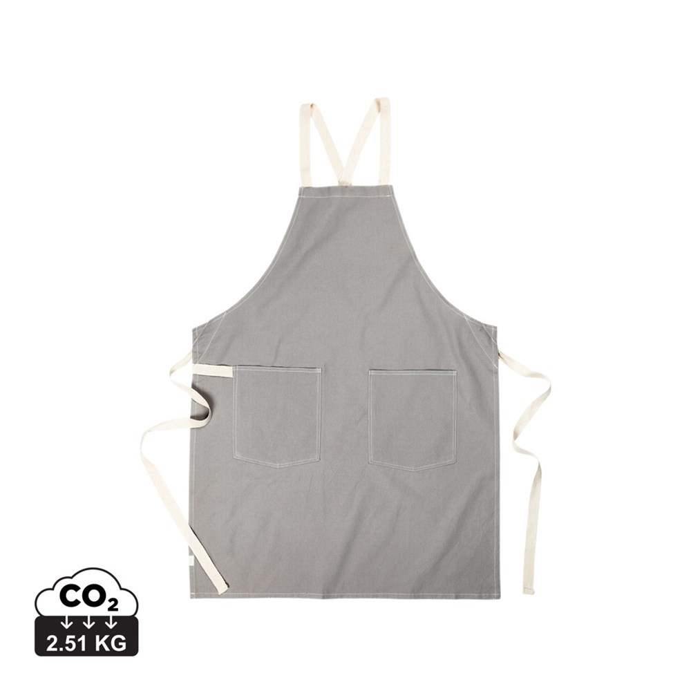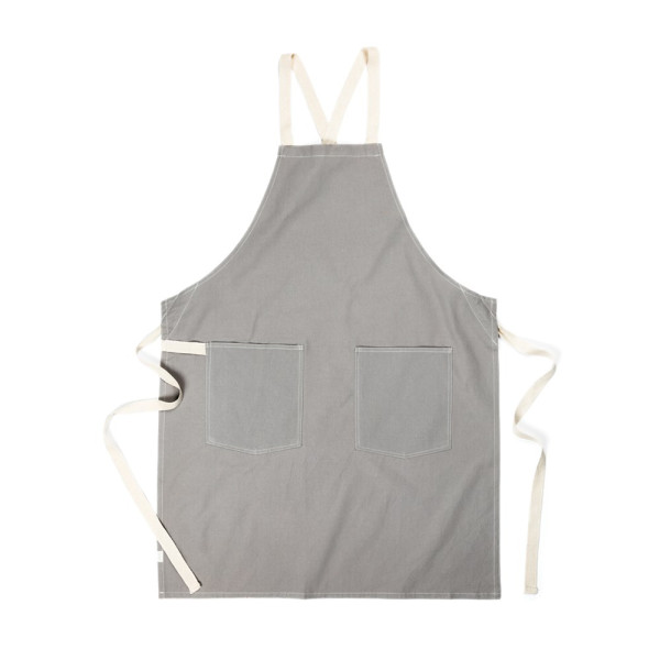 Apron made from 70% certified recycled cotton from suppliers' cotton waste. Fibres that are usually considered unusable have, with the appropriate manufacturing process, achieved the desired properties. This apron is extra wide to provide maximum protection. Two large front pockets and a loop for hanging utensils or a tea towel.