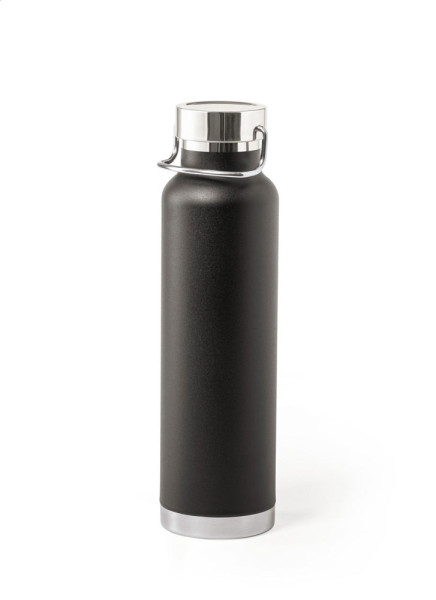 Double-wall stainless steel, copper insulated vacuum bottle with carry lid, 650 ml. Copper insulation keeps drinks hot for 12 and cold for 24 hours.