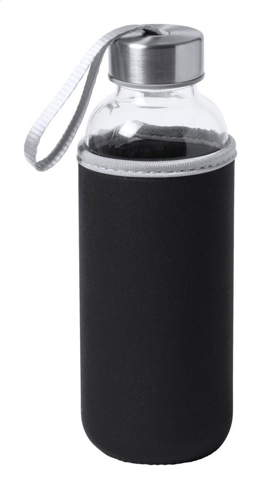 Glass bottle with carry strap on cap and coloured neoprene cover. 420 ml. Not suitable for carbonated drinks.
