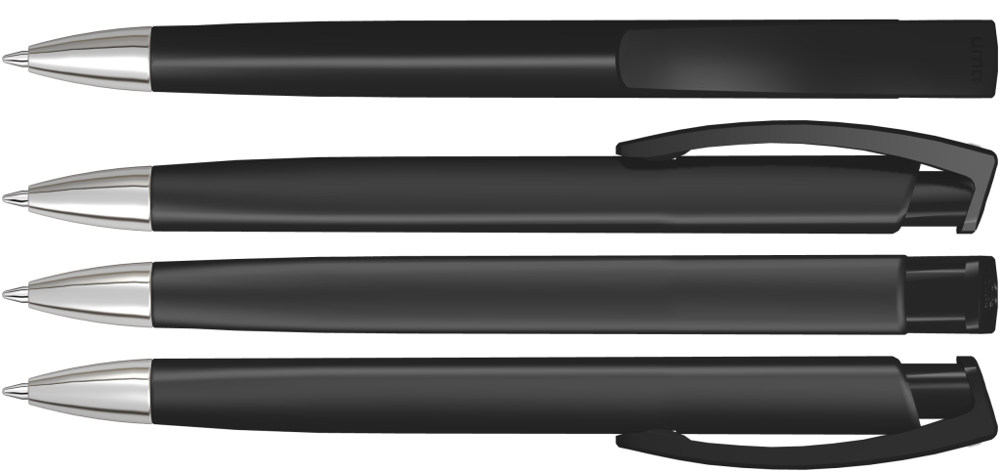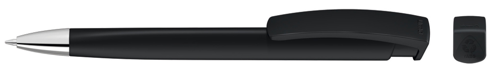 Retractable ballpoint pen with opaque matt triangular housing and clip made from recycled ABS plastic and heavy metal tip chrome plated. The model is labelled with the recycling mark.