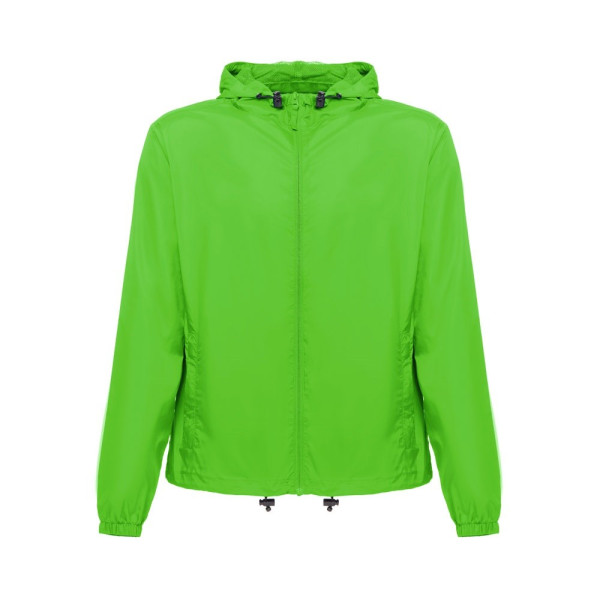 Waterproof windbreaker (Unisex) in 100% recycled nylon taffeta fabric (65 g/m²). Front opening with YKK® zipper - a brand that uses modern equipment and high quality control. The hood is lined with mesh and has drawstrings for tightening. It has eyelets for easy ventilation, elastic fastening with stoppers at the and bottom and zippered side pockets. Sizes: XS, S, M, L, XL, XXL