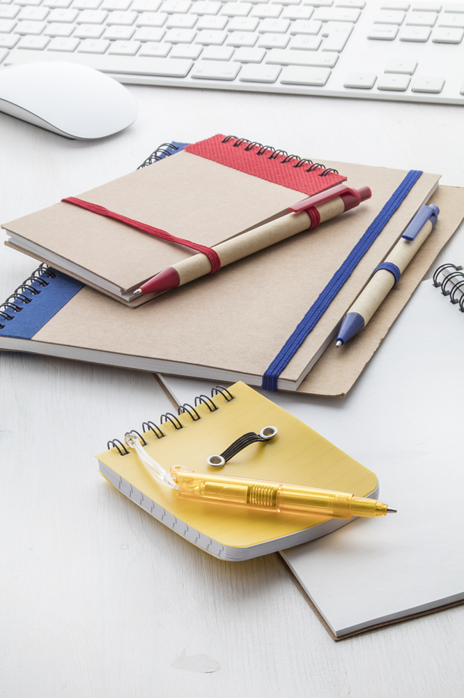 Recycled paper, 60 blank sheets spiral notebook with paper ballpoint pen.
