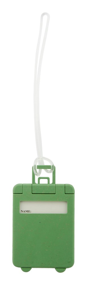 Ecological wheat straw plastic luggage tag in trolley bag shape, with elastic strap.