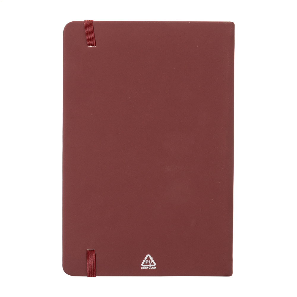 Recycled PU leather covered notebook with 100 blank sheets in recycled paper. With matching colour bookmark and rubber band. A5 size.