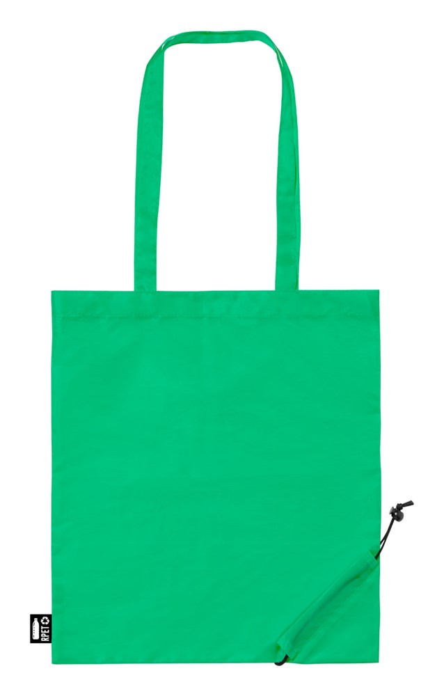 Foldable RPET shopping bag with long handles. 190T RPET polyester, with distinctive RPET label.
