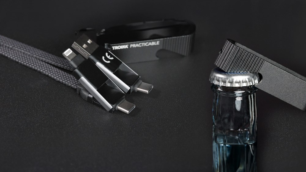 Power Delivery cable with bottle opener for on the go, USB/USB-C to Lightning or USB-C, with data transfer function, textile-braided cable, metal, matt, black