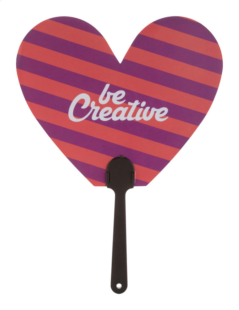 Custom made hand fan with plastic handle and laminated paper. Digital printed with your graphic on both sides. MOQ: 100 pcs.