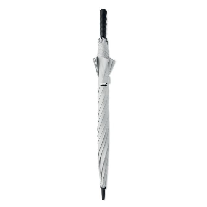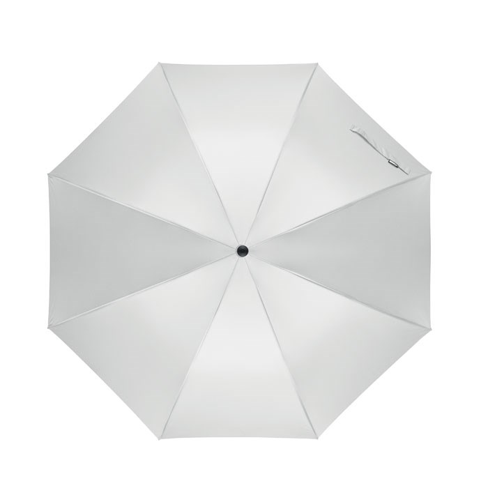 27 inch auto open wind-proof umbrella in 190T RPET pongee. Fibreglass shaft and ribs. Wheatstraw and recycled ABS handle. Plastic tips and top.