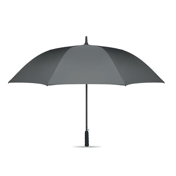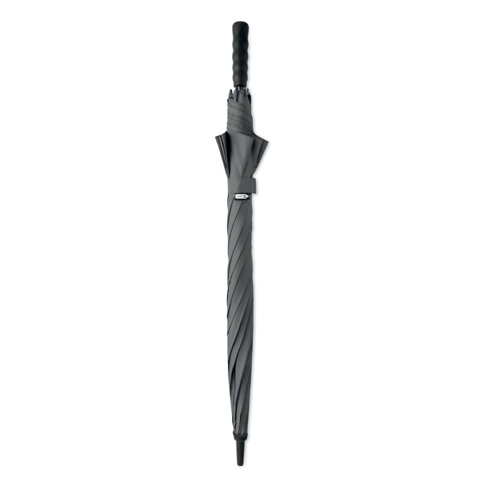 27 inch auto open wind-proof umbrella in 190T RPET pongee. Fibreglass shaft and ribs. Wheatstraw and recycled ABS handle. Plastic tips and top.