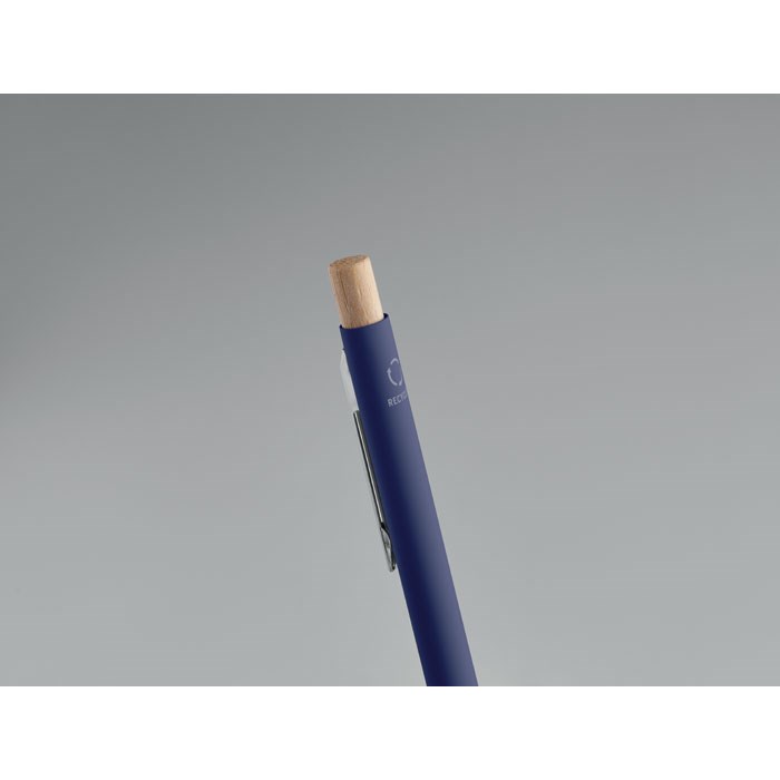 Recycled aluminium with bamboo push button. Silver tip and clip. Blue ink.