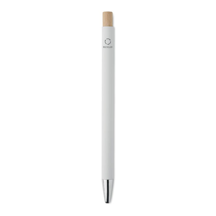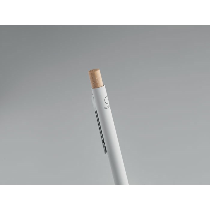 Recycled aluminium with bamboo push button. Silver tip and clip. Blue ink.
