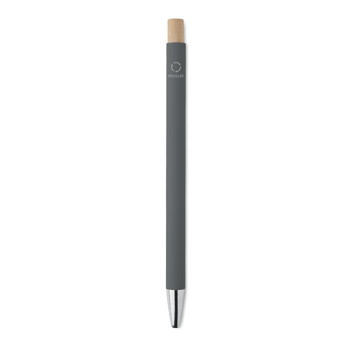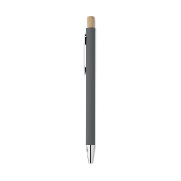 Recycled aluminium with bamboo push button. Silver tip and clip. Blue ink.