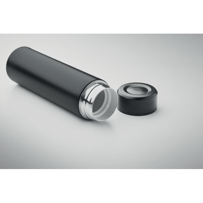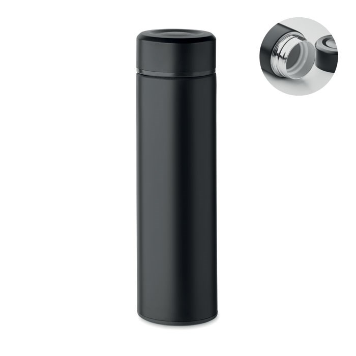 Double wall vacuum insulating bottle in recycled stainless steel (90% recycled stainless steel and 10% stainless steel) with ceramic inner lining. Leak-free. Capacity: 420 ml.