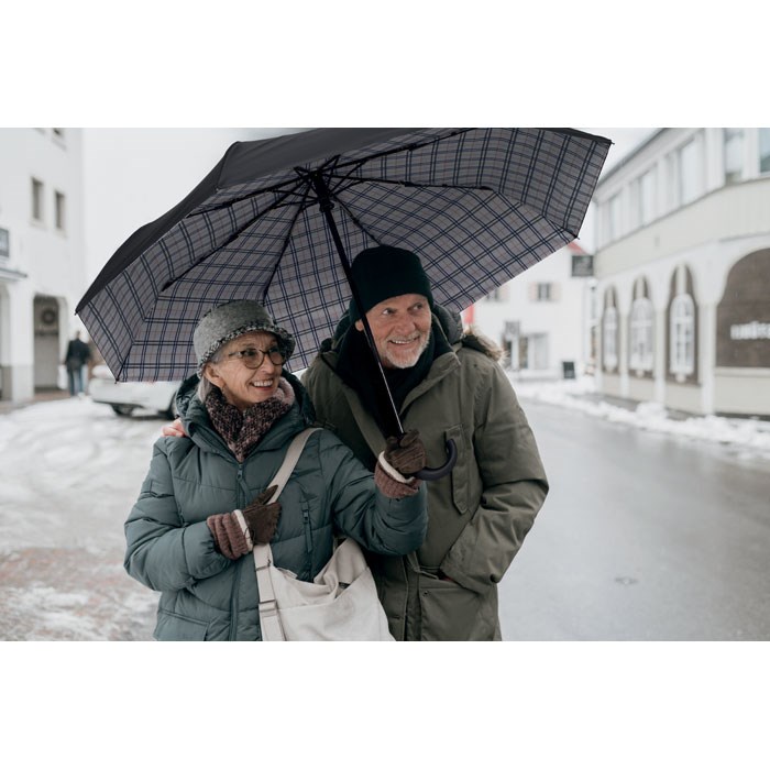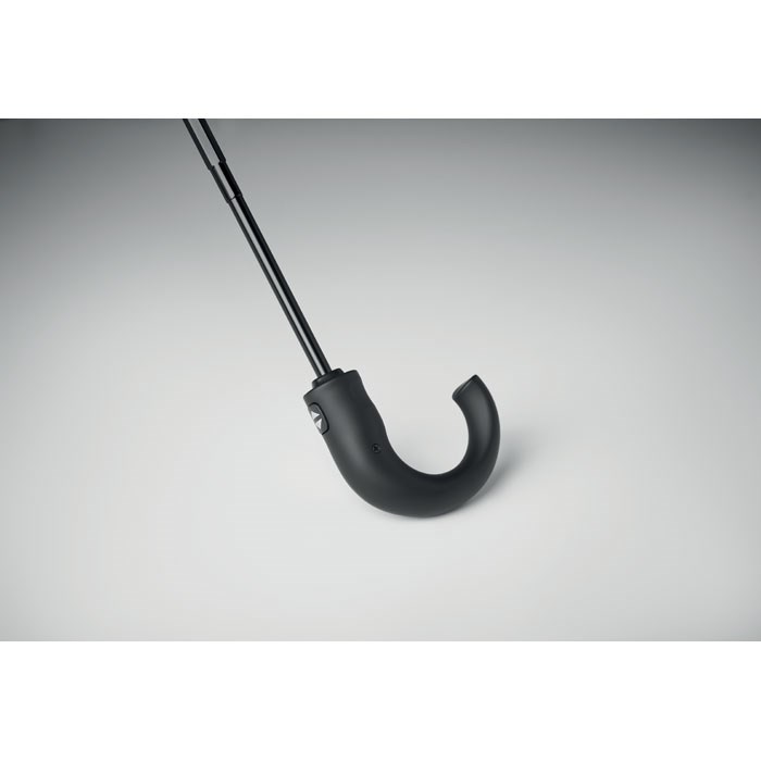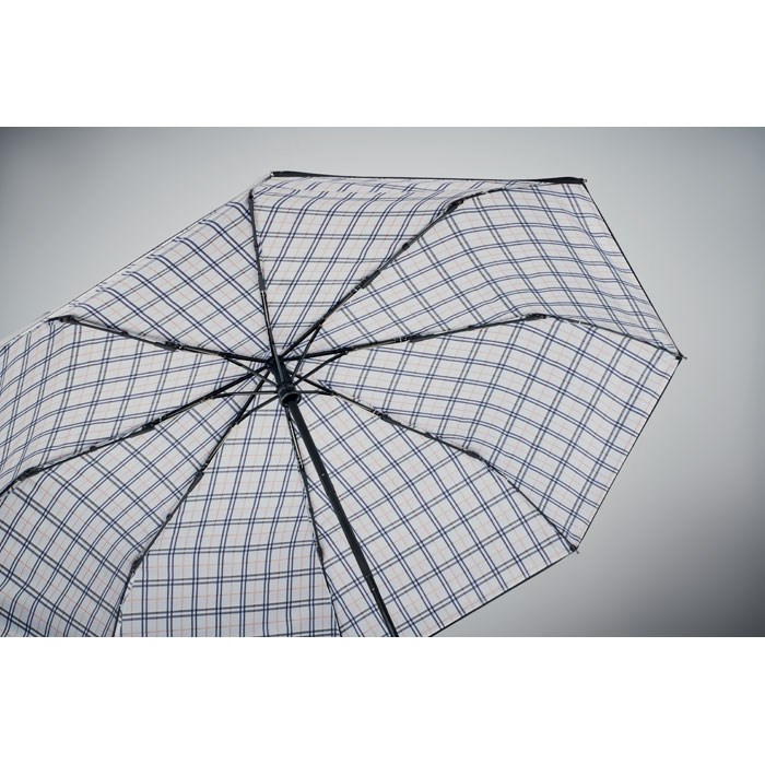 23 inch 3 fold auto open/close windproof umbrella in double-layer 190T pongee with chequered inside pattern. Black plated frame and shaft. Two-section black fibreglass nickel plated middle part. Curved wooden handle.