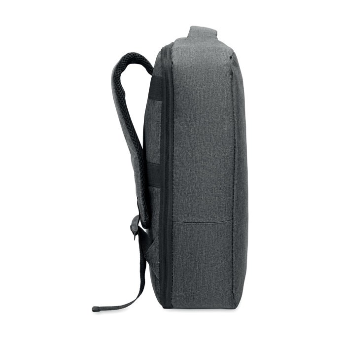 Slim 15 inch laptop backpack in 300D RPET with safe 180 degree opening with 210D RPET lining. Includes laptop compartment, 2 internal slip pockets, 2 internal pen pockets and 2 padded carry handles. Soft padded back and shoulder straps. Suitcase sleeve.