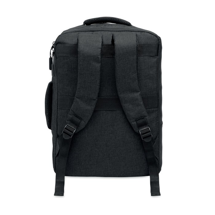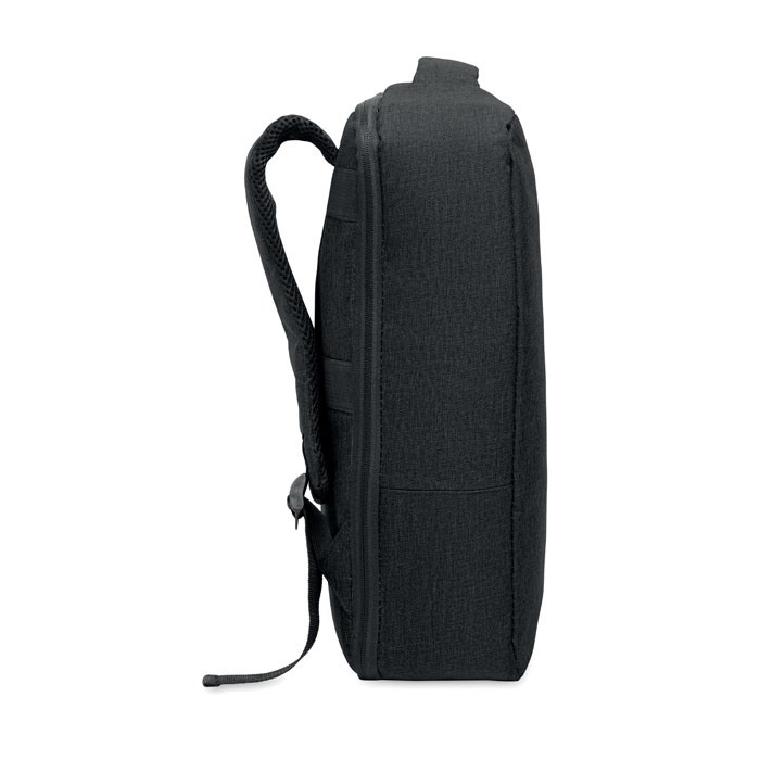 Slim 15 inch laptop backpack in 300D RPET with safe 180 degree opening with 210D RPET lining. Includes laptop compartment, 2 internal slip pockets, 2 internal pen pockets and 2 padded carry handles. Soft padded back and shoulder straps. Suitcase sleeve.