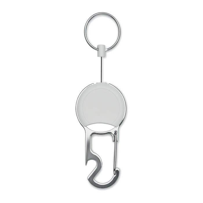Retractable badge holder in ABS with clip, key ring and bottle opener.
