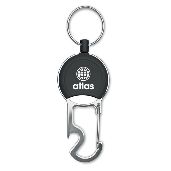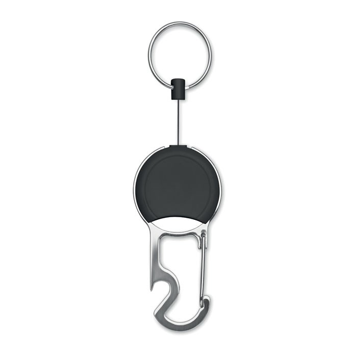 Retractable badge holder in ABS with clip, key ring and bottle opener.