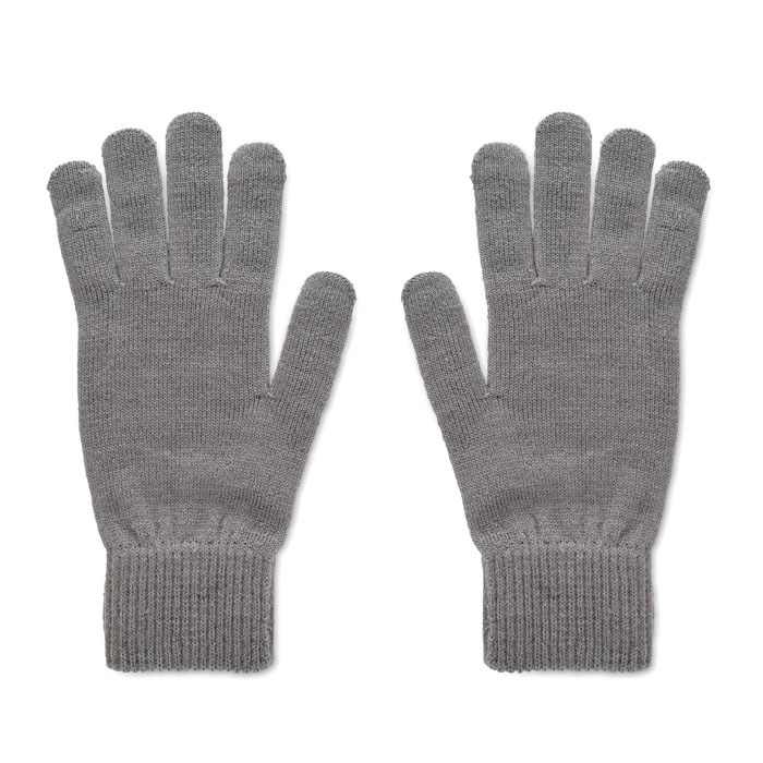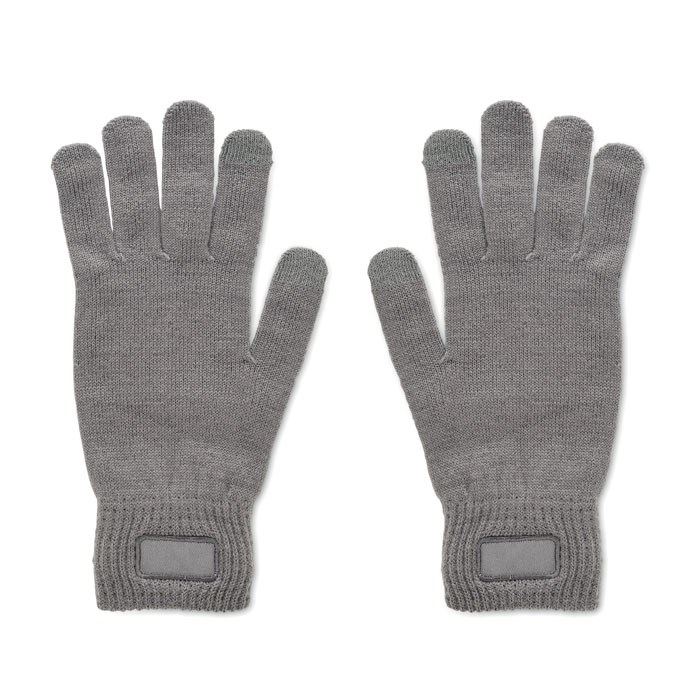 Knitted gloves in soft stretchable RPET polyester with decoration patch.