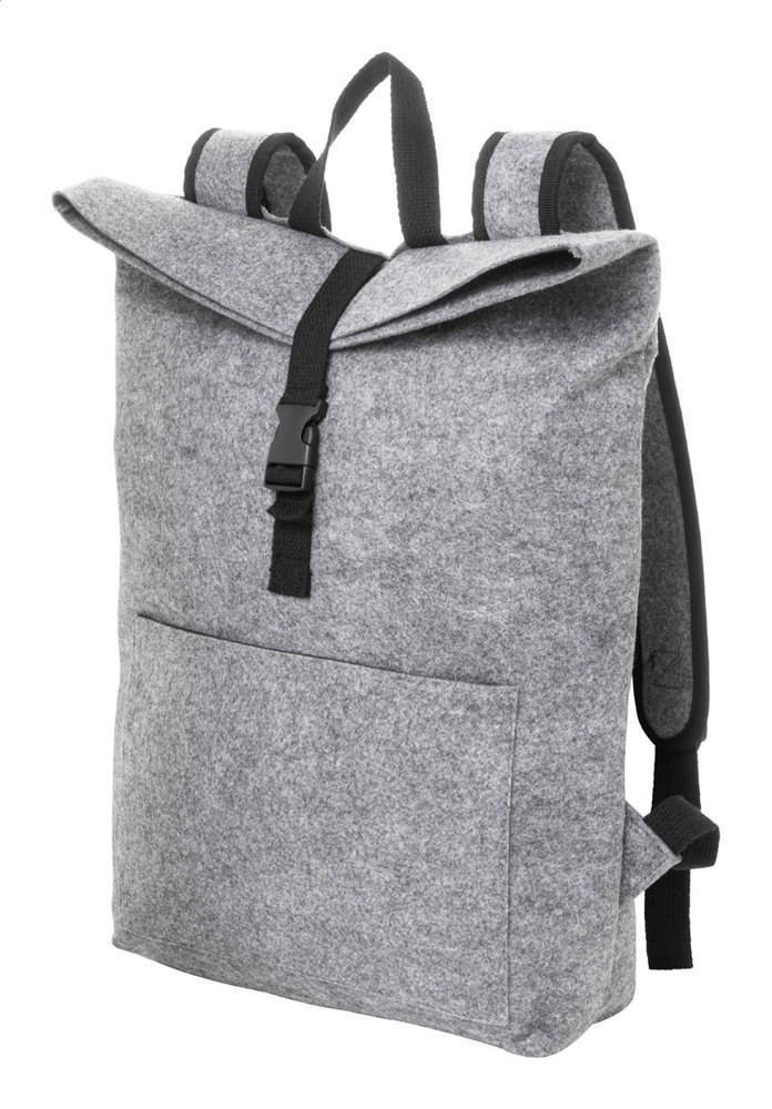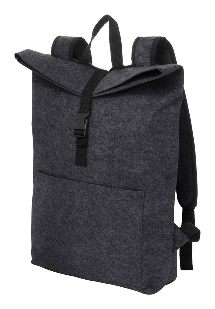 RPET felt rolltop backpack with buckle closure main compartment and zipped front pocket, laptop (15") compartment and padded shoulder straps. With distinctive RPET label.