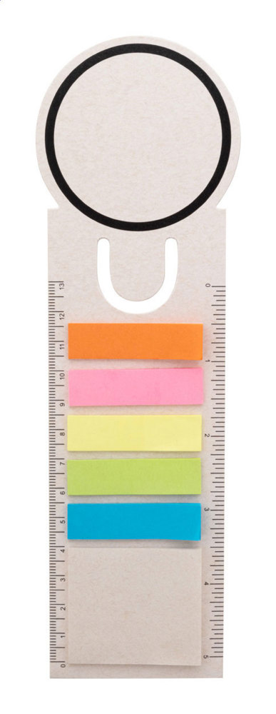 Recycled milk carton paper bookmark and ruler with 15 sticky notes and 75 page markers (in 5 different colours).