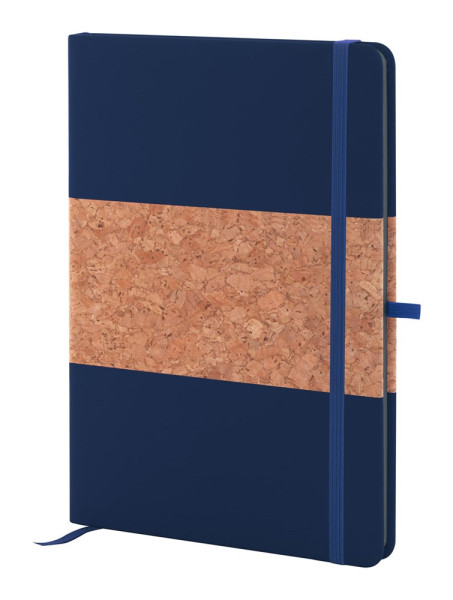 Natural cork and recycled PU leather covered notebook with matching colour bookmark, elastic band and pen holder. With 80 lined sheets in recycled paper. A5 size.
