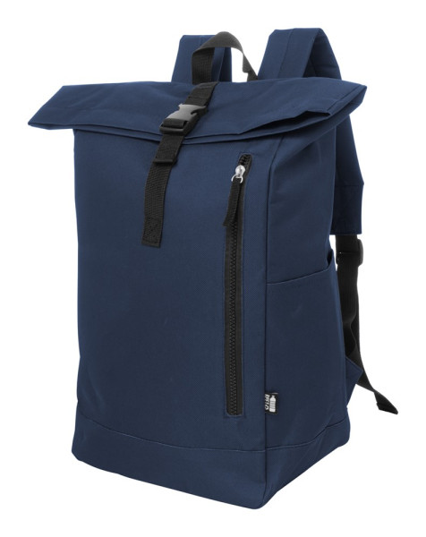 RPET rolltop backpack with buckle closure, laptop (14") compartment and zipped front pocket. With padded back and shoulder straps. 600D RPET polyester with distinctive RPET label.