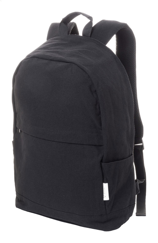 Recycled canvas backpack with zipped main compartment, padded laptop (15") compartment, zipped front pocket, side pockets, trolley strap, padded back and shoulder straps. With hidden anti-theft pocket. 70% recycled cotton and 30% RPET polyester. With distinctive recycled cotton label.
