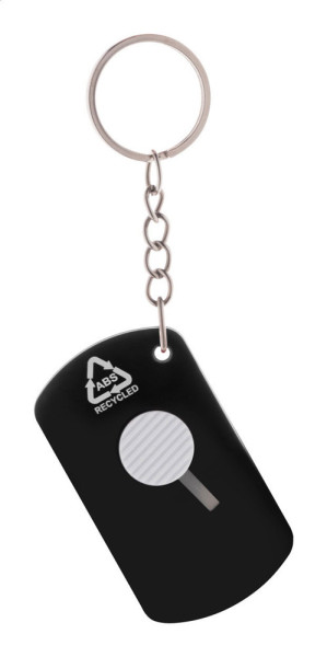 Recycled ABS plastic and stainless steel paper knife with self-retracting blade and metal keyring.