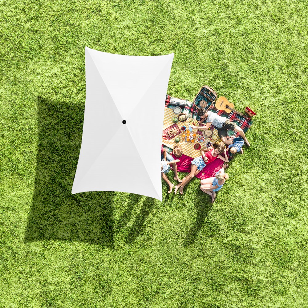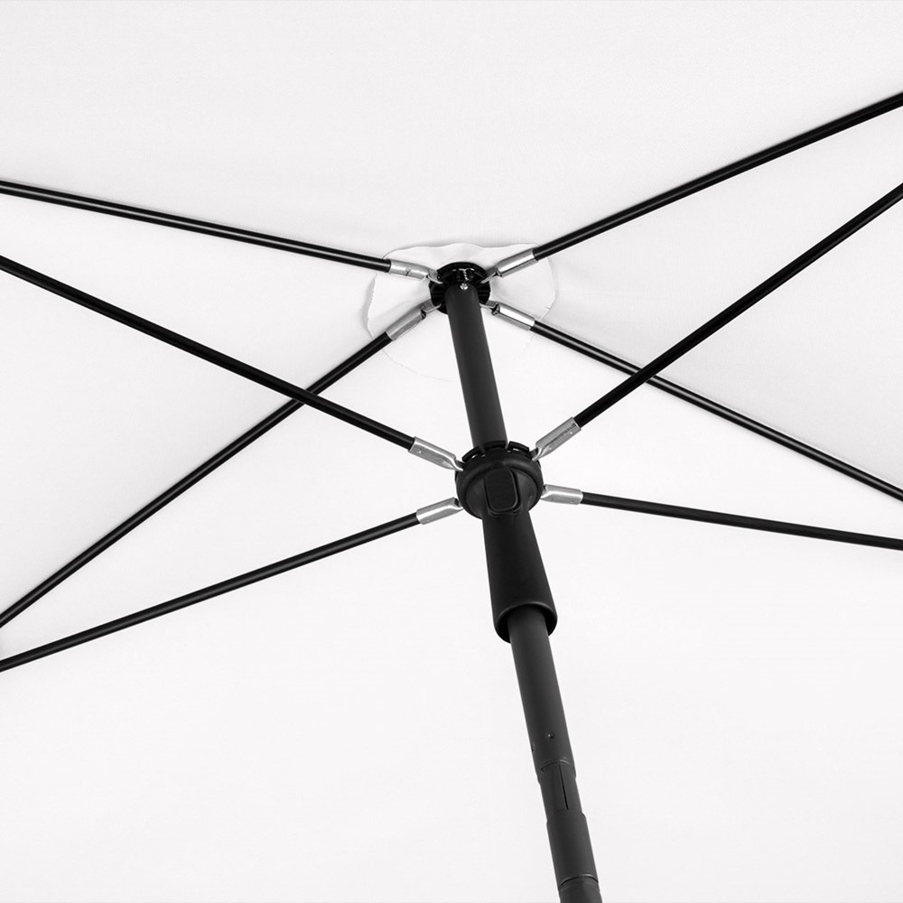 Modern, rectangular parasol with frame in a titanium finish, tilt mechanism and volant Easy handling thanks to safety runner, very robust fibreglass ribs, two-part and infinitely height-adjustable shaft with tilt mechanism for tilting the umbrella, shaft in elegant titanium finish, lower shaft with approx. 119 cm length and twist lock for secure fixing, comfortable carrying case, high-quality cover with a grammage of approx. 200 g/m² and UPF 50+ sun protection factor, cut volant, exclusive parasol base (Art. 8920 or Art. 8905) / ground spike (Art. 8939)