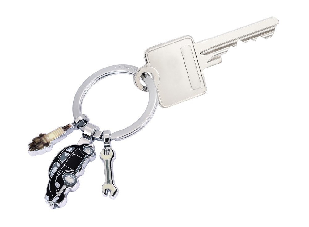 Keyring with 3 charms, Volkswagen Type 1, wrench, spark plug, cast metal, enamel, chrome plated, shiny, black/silver-coloured