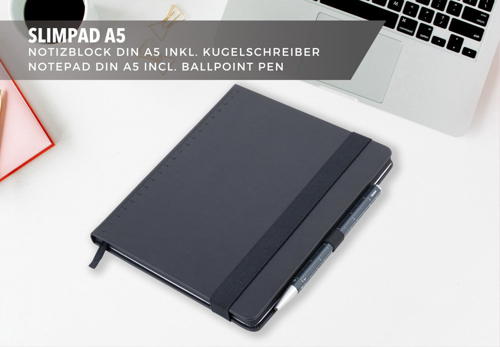 Notepad DIN A5 incl. ballpoint pen, black elastic strap fastener, pen loop, bookmark, embossed... more