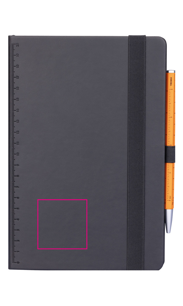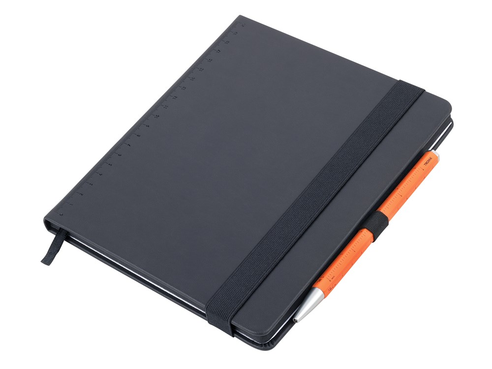 Notepad DIN A5 incl. ballpoint pen, black elastic strap fastener, pen loop, bookmark, embossed ruler (20 cm) on cover, FSC certified paper, 64 perforated sheets (128 pages), with black inked margins, dot grid, compartment for receipts, CONSTRUCTION BASIC ballpoint pen (black D1 refill), imitation leather, metal, matt, black