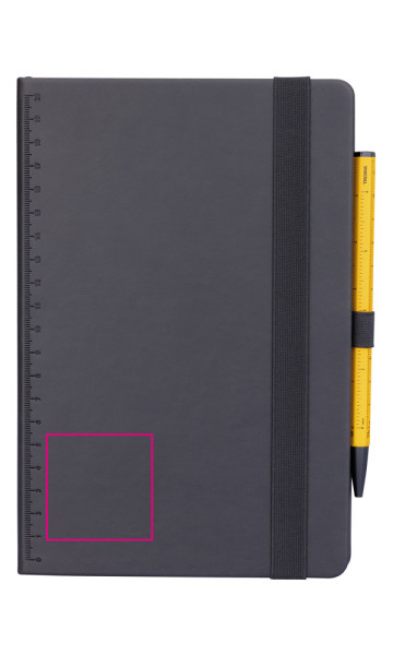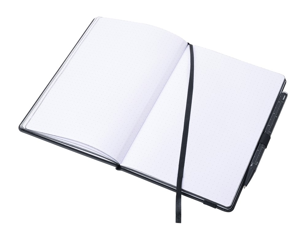 Notepad DIN A5 incl. ballpoint pen, black elastic strap fastener, pen loop, bookmark, embossed ruler (20 cm) on cover, FSC certified paper, 64 perforated sheets (128 pages), with black inked margins, dot grid, compartment for receipts, CONSTRUCTION BASIC ballpoint pen (black D1 refill), imitation leather, metal, matt, black