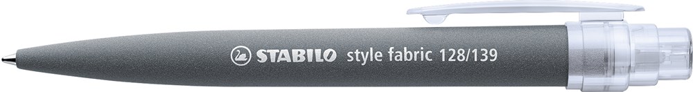 WE DO IT FABRIC STYLE! Stylish plastic ballpoint pen with jumbo refill and comfortable, extra wide push-button. Shaft in grey with new, cool “industry style” finish with surprising feel. Can be combined with a transparent top in 1 of 7 trendy colors. Also available with metal clip.