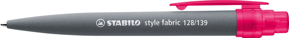 WE DO IT FABRIC STYLE! Stylish plastic ballpoint pen with jumbo refill and comfortable, extra wide push-button. Shaft in grey with new, cool “industry style” finish with surprising feel. Can be combined with a transparent top in 1 of 7 trendy colors. Also available with metal clip.