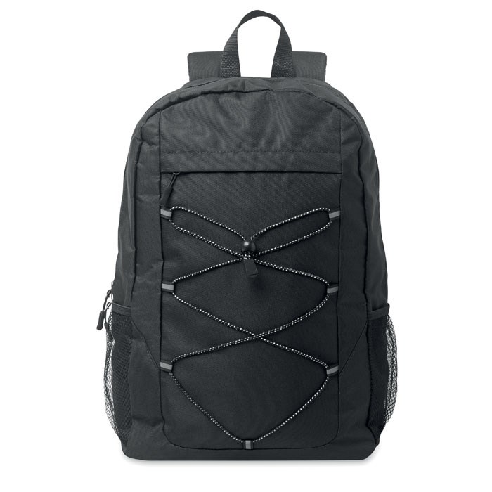 Backpack in 600D RPET polyester with decorating cord and front zippered pocket panel. Mesh pockets on both sides.