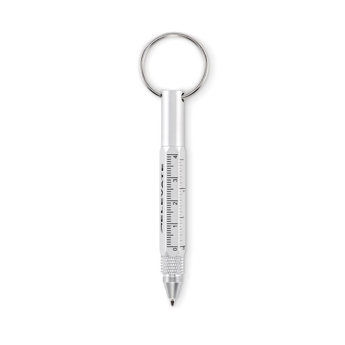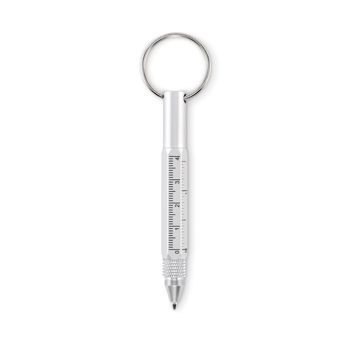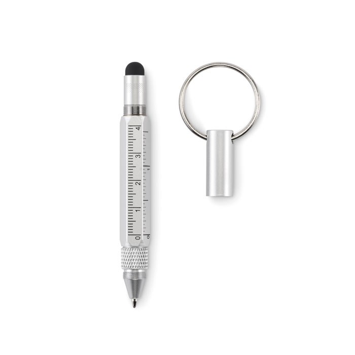 Key ring with twist action pen in recycled aluminium with 4cm/ 1,5 inch ruler, stylus and 2 in 1 phillips and flat head screw driver. Black ink.