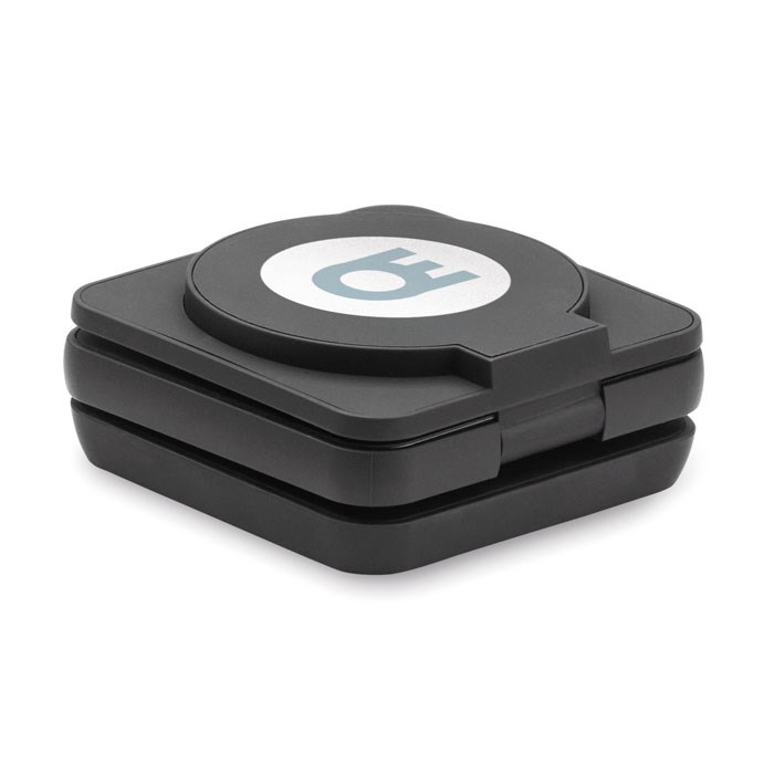 3 in 1 foldable charging station in rubberized recycled ABS. It includes a magnetic wireless charger 15W, smartwatch charger (Apple®only) and TWS charger.