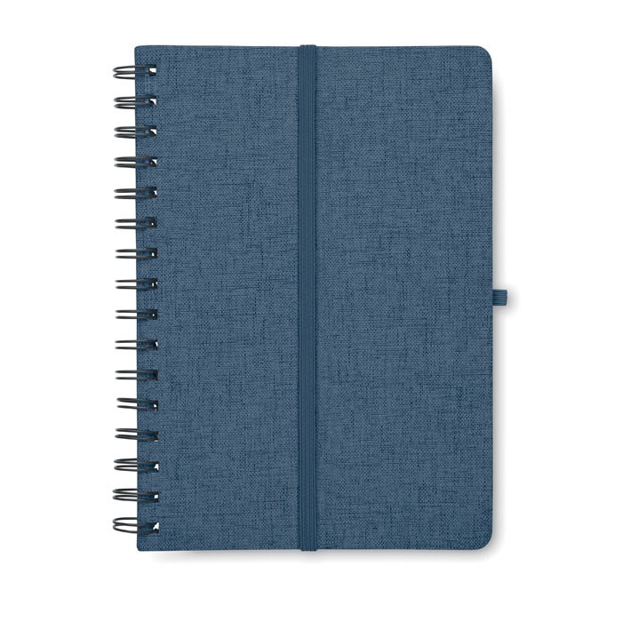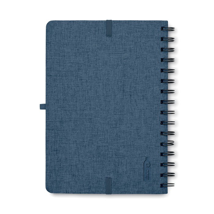 A5 notebook with 600D RPET hard cover with smartphone stand function. Twin-wire. 160 lined pages (80 sheets). 70 gsm recycled paper. Elastic closure strap.