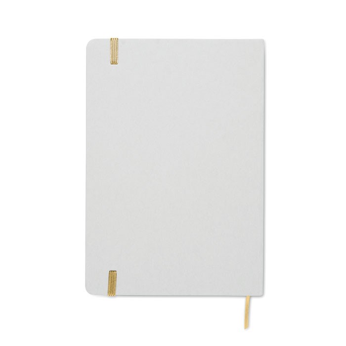 A5 notebook with hard recycled carton cover. White cover. Casebound. 160 lined recycled paper pages (80 sheets). Elastic closure strap, ribbon bookmark matching with revealed colour. After laser engraving the colour is revealed.