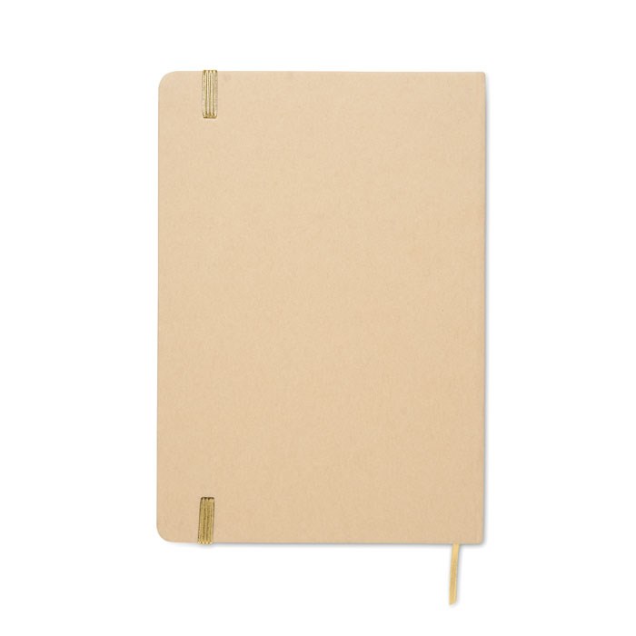 A5 notebook with hard recycled carton cover. Beige cover. Case bound. 160 lined recycled paper pages (80 sheets). Elastic closure strap, ribbon bookmark matching with revealed colour. After laser engraving the colour is revealed. FSC®-certified | FSC MIX CREDIT, P7.1, FSC-C213206