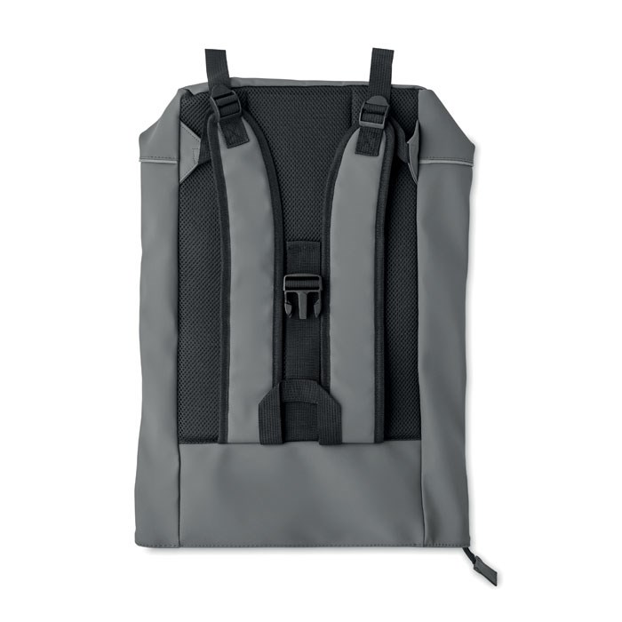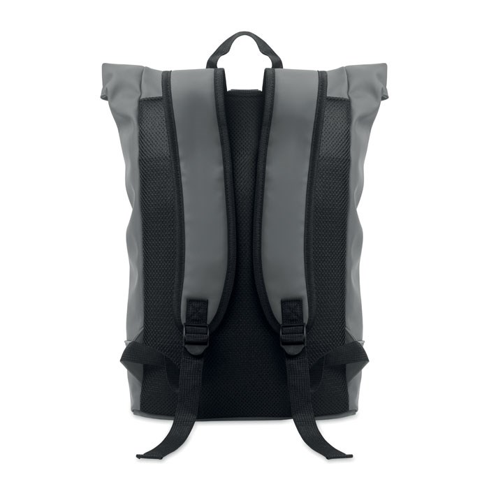 15 inch roll top laptop backpack in soft PU with padded back and base reinforcement with reflective strip. Waterproof zippered front pocket. 210D RPET polyester lining.